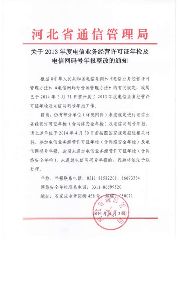 河北省关于2013年度电信业务经营许可证年检及电信网码号年报整改的通知