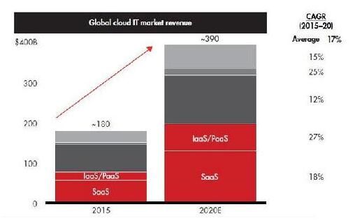 报告称,到2020年,全球云计算市场收入将达到3900亿美元,与2015年时的1800亿美元规模相比,CAGR为17%。同时期内,基于SaaS(软件即服务)的应用市场规模的CAGR为18%,基于IaaS/PaaS(基础设施即服务/平台即服务)应用市场规模的CAGR为27%。