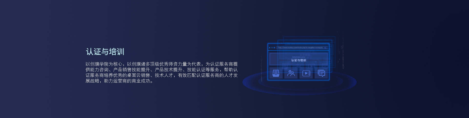聚焦全国优秀的学习和发展资源,以创旗独立自主的知识产权为基础,从研发、生产、销售、 售后、技术支持等为认证服务商提供全面而系统的云桌面人才培养方案。