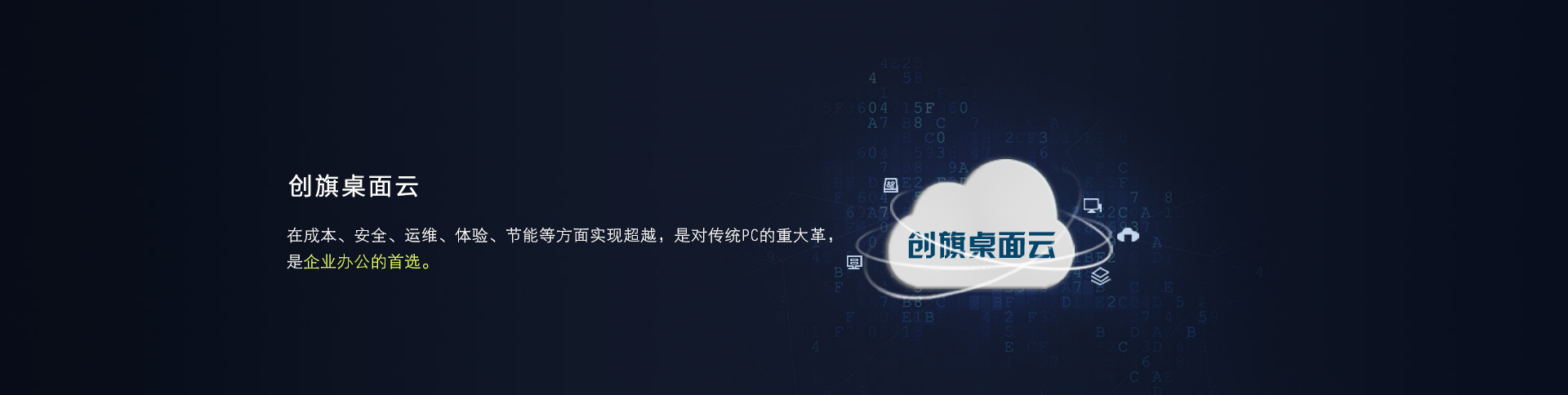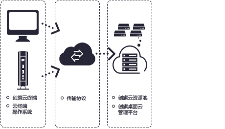 创旗桌面云是一种基于云计算的桌面服务整体解决方案,其通过云终端或者网页来访问云资源池的应用程序以及整个虚拟桌面,用户体验与传统PC保持一致,但在成本、安全、运维、体验、节能等方面实现超越,是对传统PC的重大革新。